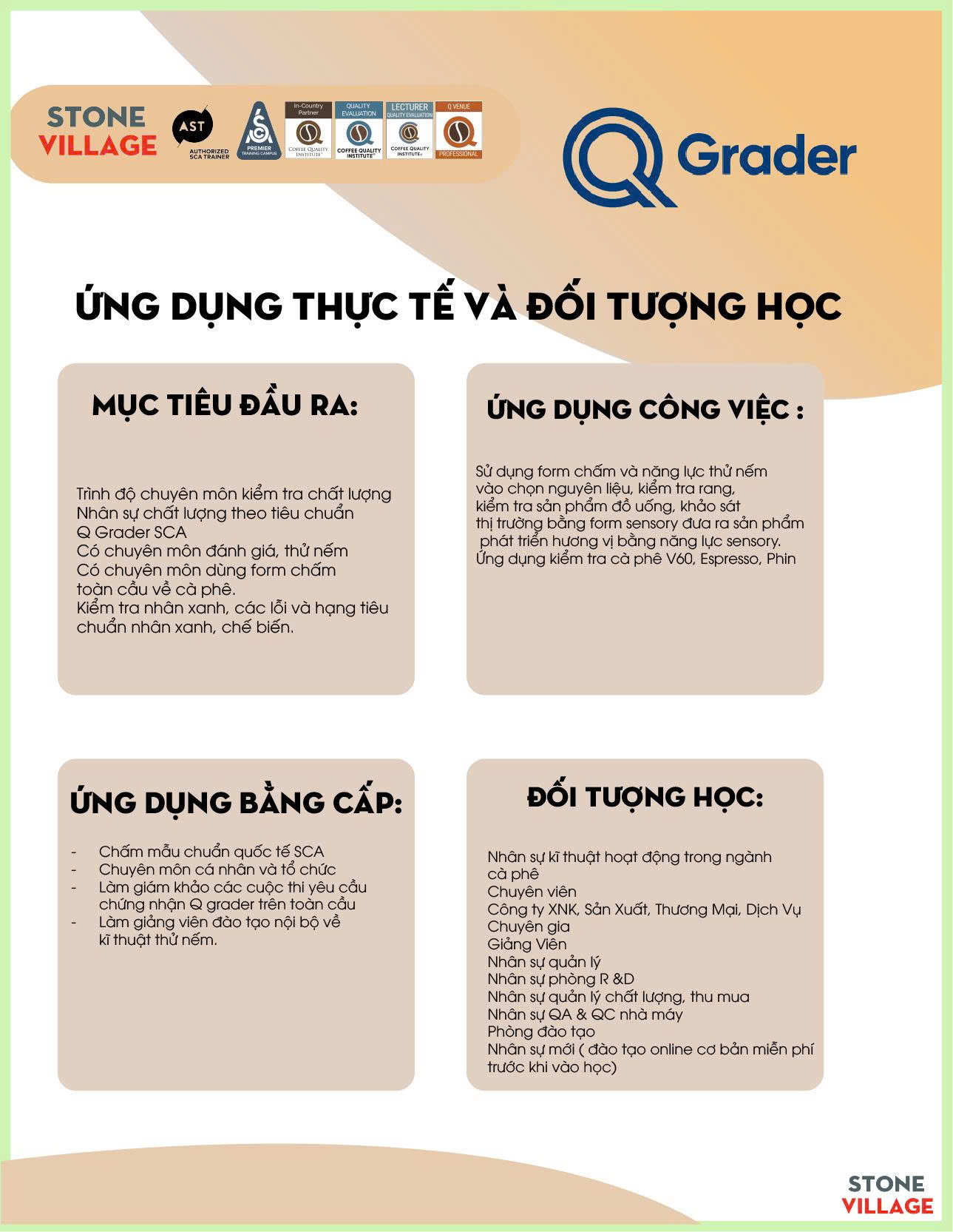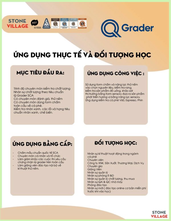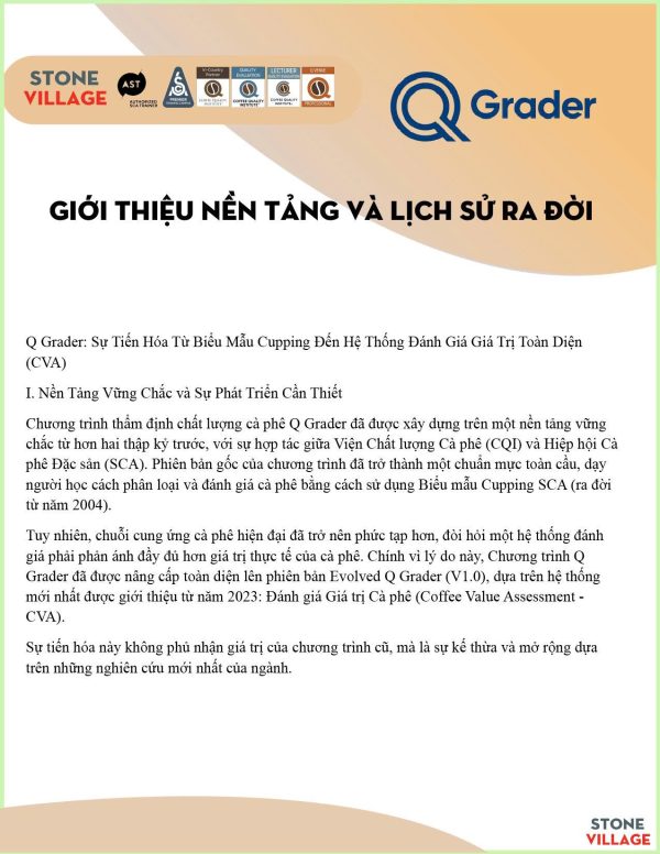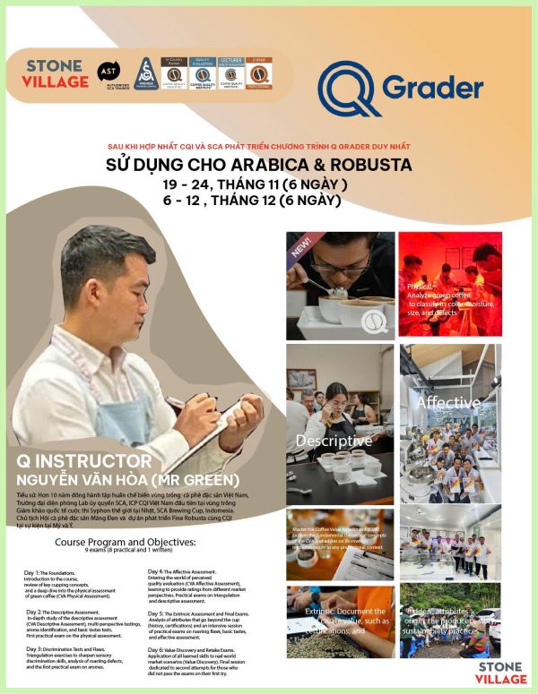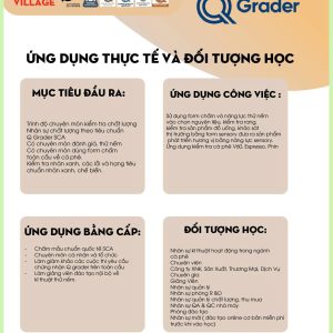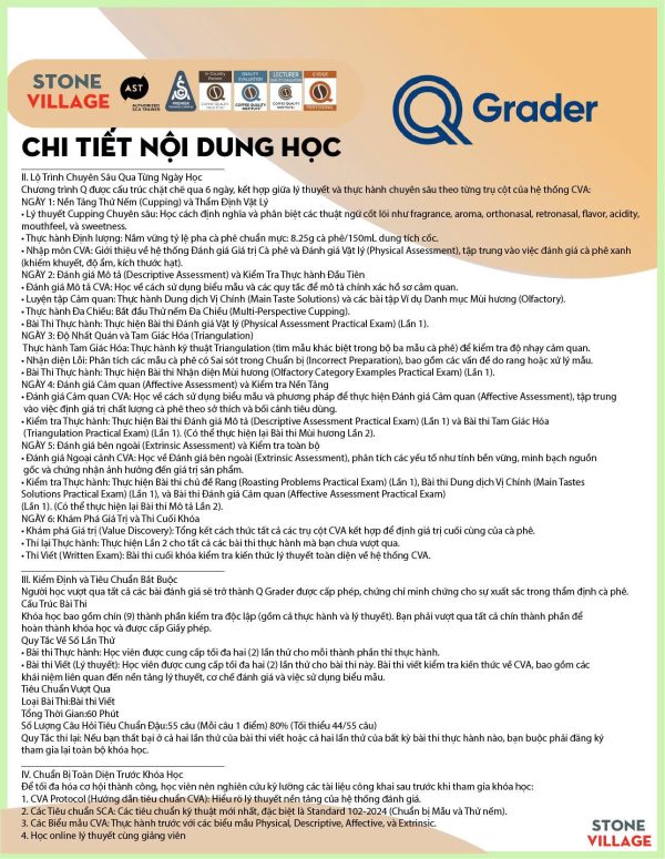 “[Chương trình Q Grader] cung cấp cơ hội cho các chuyên gia cà phê giàu kinh nghiệm mài sắc hiểu biết lý thuyết và ứng dụng thực hành của Đánh giá Giá trị Cà phê (CVA). Sử dụng các công cụ và kỹ thuật dựa trên nghiên cứu, được tiêu chuẩn hóa trong ngành, người tham gia khóa học sẽ sử dụng các đánh giá vật lý, mô tả, cảm tính và ngoại cảnh để xác định các thuộc tính và đánh giá cà phê từ nhiều góc độ khác nhau.” (Trích từ Hướng dẫn Chương trình Q Grader V1.0)