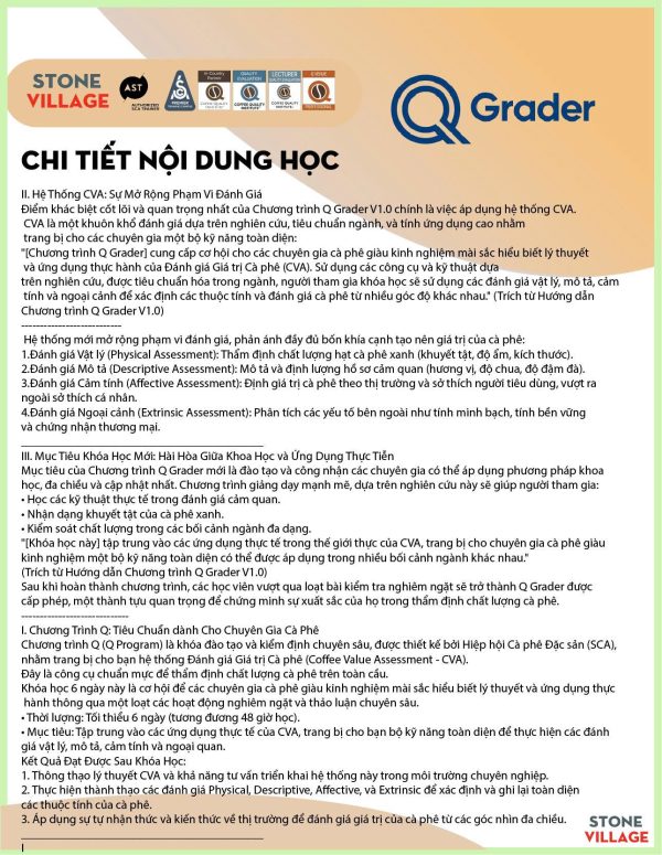 “[Khóa học này] tập trung vào các ứng dụng thực tế trong thế giới thực của CVA, trang bị cho chuyên gia cà phê giàu kinh nghiệm một bộ kỹ năng toàn diện có thể được áp dụng trong nhiều bối cảnh ngành khác nhau.” (Trích từ Hướng dẫn Chương trình Q Grader V1.0)